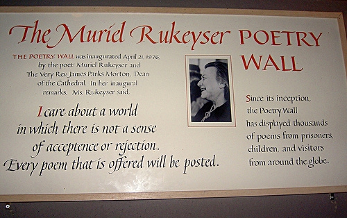 Un meraviglioso esempio della visione relazionale della poesia che aveva Muriel Rukeyser è data dal Poetry Wall che si trova nella Cattedrale di St. John in Manahttan - New York. Fu fondato nel 1976 dalla stessa poetessa come luogo di apertura e libertà della poesia. Qui si accetta qualsiasi poesia venga presentata ed in ogni lingua, firmata o meno.